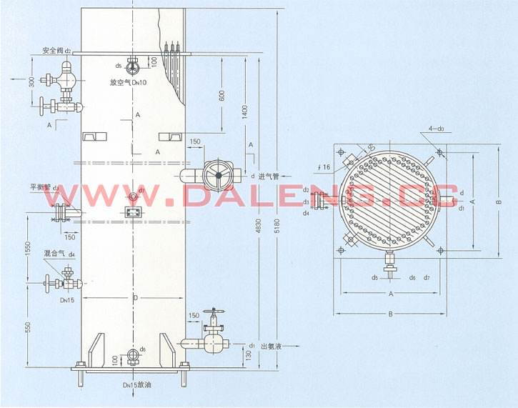 立式壳管式热交换器。圆筒形壳体上端与一圆形管板,下部与一方形管板焊接成一体,下管板兼起支座的作用。在两管板间装有传热管(无缝钢管) ,管与管板间是以焊接方式连接。上管板的上方设有配水槽。传热管上口均装有一个带斜槽的分水器,使水通过斜槽的分水器,使水通过斜槽形成螺旋状水流沿管内壁流下,以提高传热效果。在壳体的2/3 高度上设有进气管,将气态制冷剂引到管壳之间的空间。在距下管板有一小距离处设有出液管。底部还设有放油管。在距底部550 毫米处设有不凝性气体放出接管。在壳体顶部设有放空气阀门,上部还有安全阀,中部装有压力表。