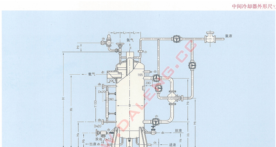 立式简形设备,筒内下部设有蛇形盘管,筒的上部有一进气接管由上方直插筒下部,在筒侧上部设有一出气接管,在侧面有一浮球阀,在筒上部的封头上设一安全阀,底部有一放油阀。液态制冷工质通过浮球阀进入中间冷却器,并保持一定液位高度,其蒸发压力保持为中间压力,低压级排气自进气管由顶部直通到筒内下部,经液体制冷工质流经筒内下部浸在液体制冷工质中的蛇形盘管,被冷却后流往调节站(或节流阅)。