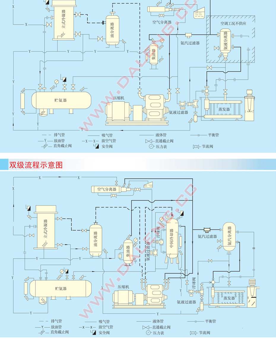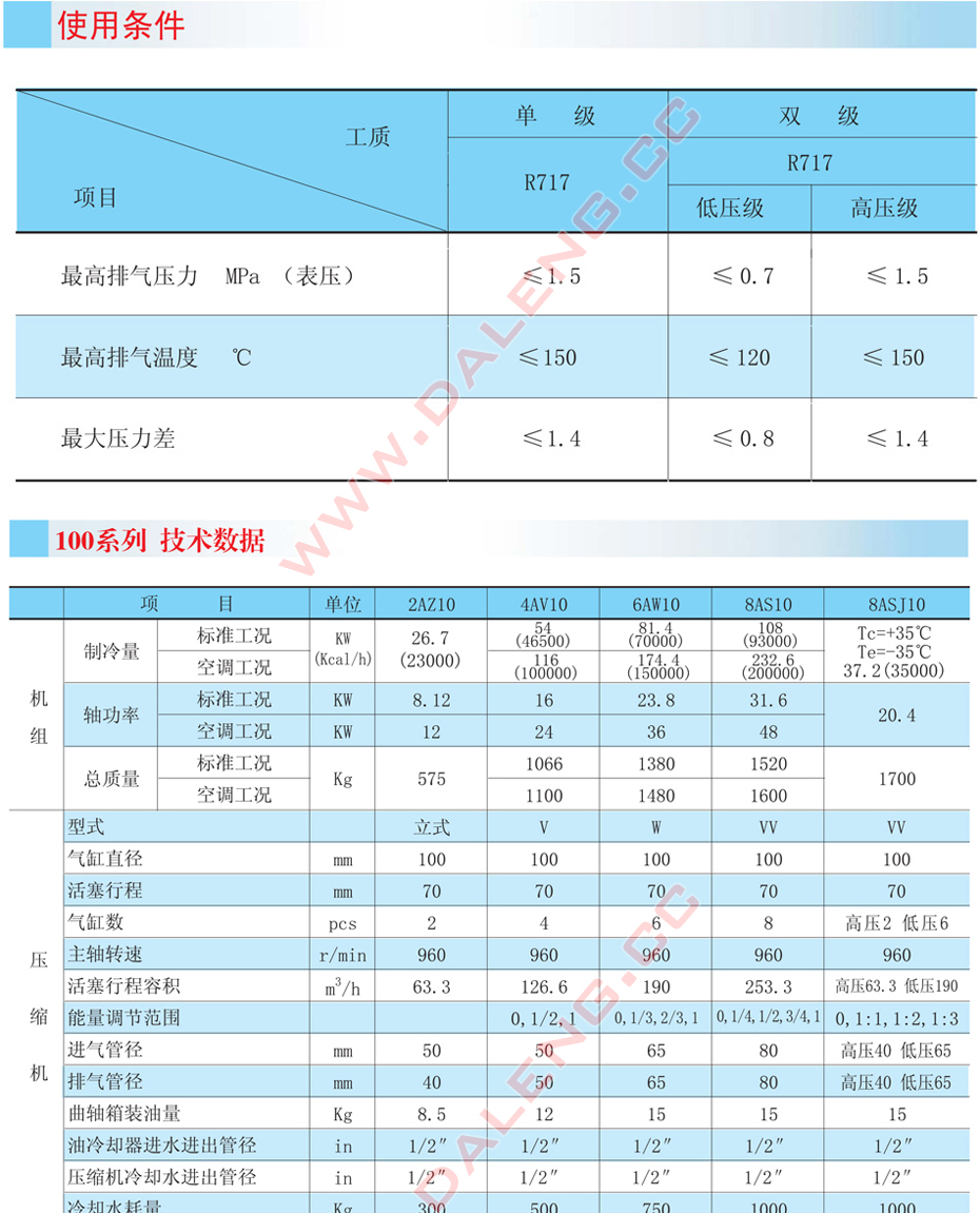 该系列压缩机在冷凝温度≤40℃,蒸发温度单级+5℃~-30℃,双级-25℃~-45℃的范围内,应用于需要实现人工制冷的场合。如石油、化工、制药等工业产品的生产, 食品的低温加工储藏和运输,工厂、医院及公众场所等大型建筑的空气调节等。