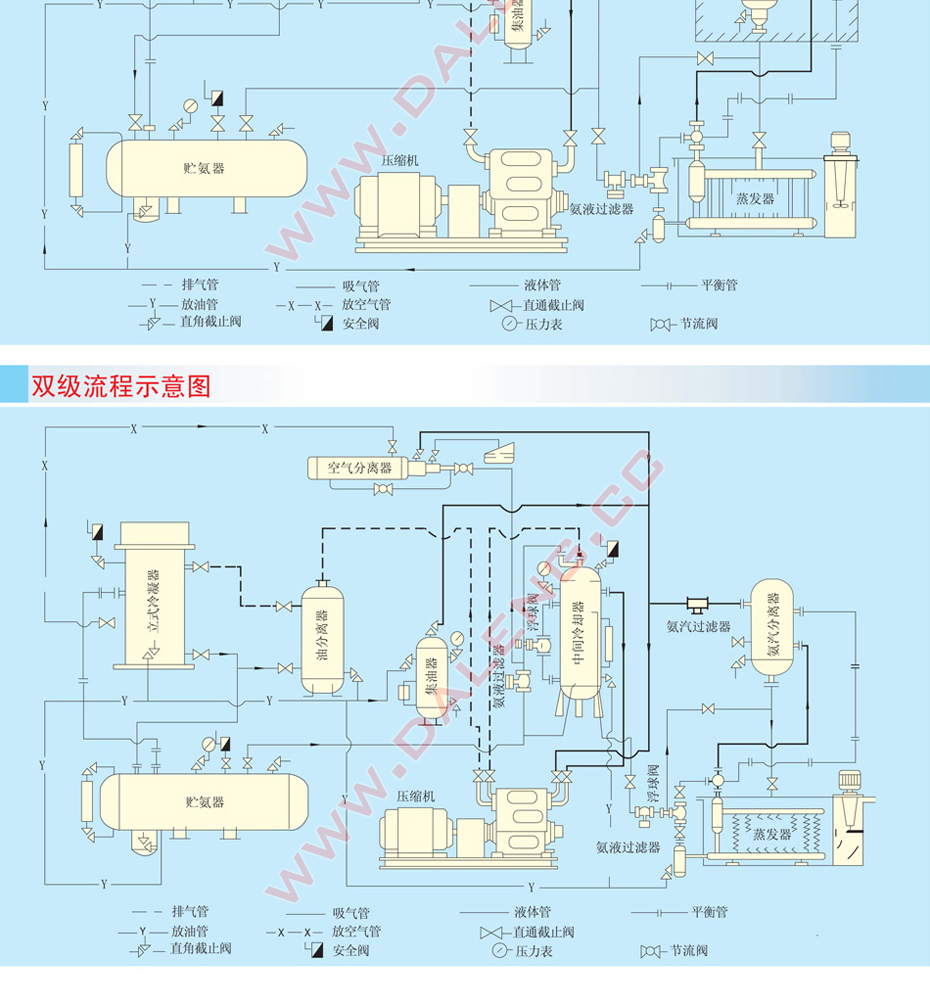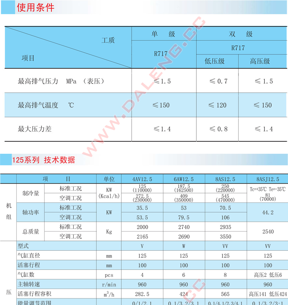 该系列压缩机在冷凝温度≤40℃,蒸发温度单级+5℃~-30℃,双级-25℃~-45℃的范围内,应用于需要实现人工制冷的场合。如石油、化工、制药等工业产品的生产, 食品的低温加工储藏和运输,工厂、医院及公众场所等大型建筑的空气调节等。
