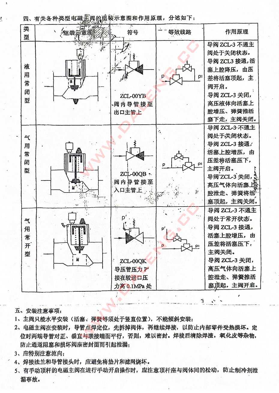 ZCL系列电磁主阀有液用、气用之分。特殊情况下液、气也可互用。液用主阀只有常闭型,气用主阀则有常开、常闭两种。