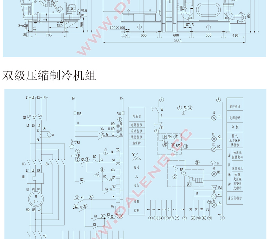船用活塞式制冷压缩机组中的压缩机有单级、单机双级两种机型,均属高速、多缸、逆流式压缩机,设有能量调节装置,可实现无负荷启动,压缩机还设有装放油阀,可在运转中加油。压缩机组由压缩机、电动机、控制台等组成,其中,单机双级机型还设有中间冷却器。所有机组均设有高效油分离器和自动回油装置。这些部件均安装在同一公共机座上。控制台上装有高、中压、油压继电器,保护机器运行安全可靠。船用机组均经摇摆台试验,可确保在航行中的可靠运行。