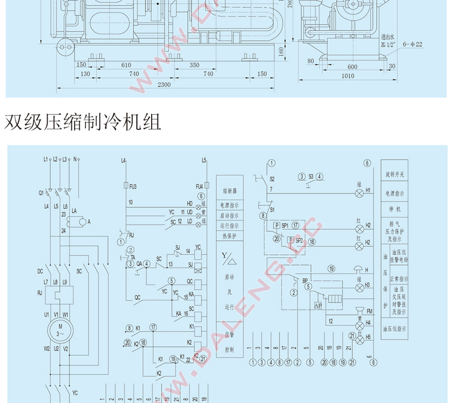 船用活塞式制冷压缩机组中的压缩机有单级、单机双级两种机型,均属高速、多缸、逆流式压缩机,设有能量调节装置,可实现无负荷启动,压缩机还设有装放油阀,可在运转中加油。压缩机组由压缩机、电动机、控制台等组成,其中,单机双级机型还设有中间冷却器。所有机组均设有高效油分离器和自动回油装置。这些部件均安装在同一公共机座上。控制台上装有高、中压、油压继电器,保护机器运行安全可靠。船用机组均经摇摆台试验,可确保在航行中的可靠运行。