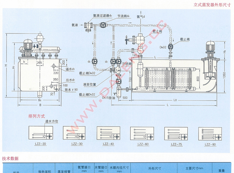 蒸发排管装在一个长方形的金属水箱内。每组蒸发管是由上、下二根水平集管及连接于其间的多根传热管所组成,因传热管型式不间,分为直管式和螺旋管式二种蒸发排管。在上集管一端焊有液体分离器,其下端有一直管与下集相通,使未蒸发的液态制冷工质回流至下集管继续吸热蒸发。下集管一端焊有直管通过箱壁与箱外集油器相通,以便放出润滑油。在蒸发排管的液体分离器上方,有一回气集管与各组蒸发排管相连,在蒸发排管中部上方有一供液集管与各排管相连。箱的一端设有盐水搅拌器,以强制盐水在箱内流动,提高传热效率。在水箱端壁上部设有溢流管。箱底部设有排液管接口,以便维修时放出盐水。