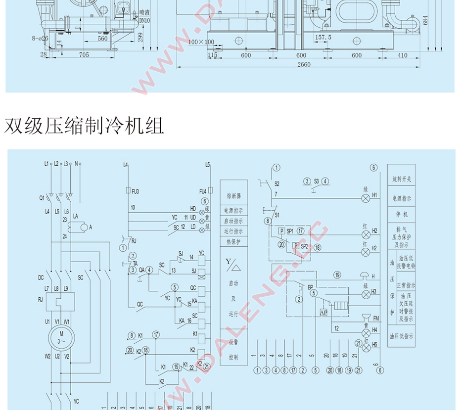 船用活塞式制冷压缩机组中的压缩机有单级、单机双级两种机型,均属高速、多缸、逆流式压缩机,设有能量调节装置,可实现无负荷启动,压缩机还设有装放油阀,可在运转中加油。压缩机组由压缩机、电动机、控制台等组成,其中,单机双级机型还设有中间冷却器。所有机组均设有高效油分离器和自动回油装置。这些部件均安装在同一公共机座上。控制台上装有高、中压、油压继电器,保护机器运行安全可靠。船用机组均经摇摆台试验,可确保在航行中的可靠运行。