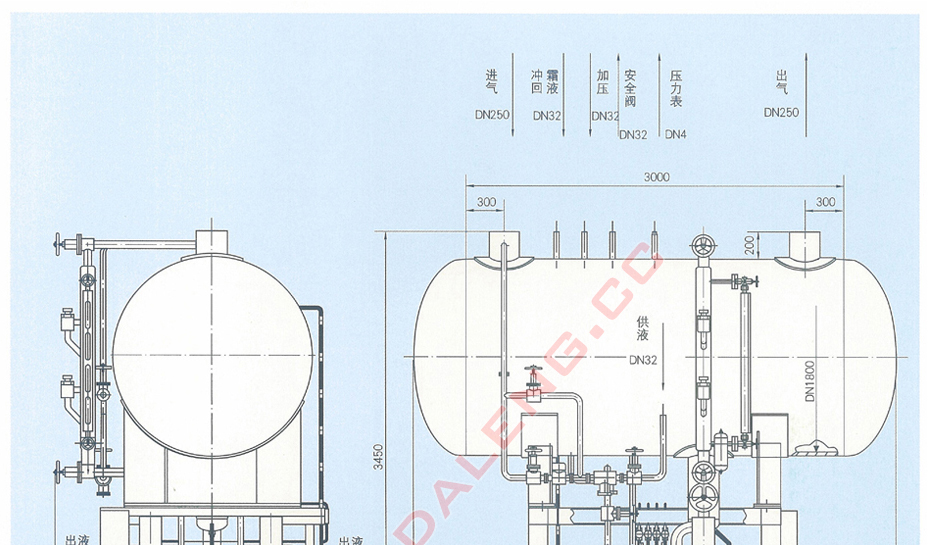 本系列组合装置将卧式低压循环贮液桶和两台离心式屏蔽电泵组装在同一钢架上,工艺管路,阀门、自控元件、电气元件均已装配齐全,构成桶泵一体化供液装置。本系列组合装置具有自动供液、液位显示、液位高度报警、氨泵自动或手动操作等功能。